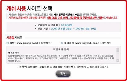 “확인” 버튼을 클릭하면 보유하고 있는 캐쉬는 선택한 사이트의 캐쉬로 전환됩니다.