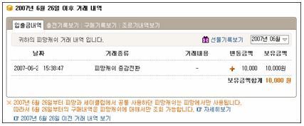 전환된 캐쉬를 확인하려면 선택한 사이트의 개인정보의 “나의계좌 > 입출금내역”에서 확인할 수 있습니다.